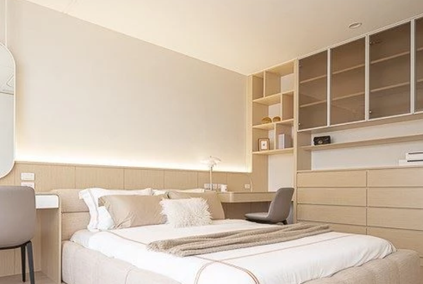 16 平方空间虽然是新成屋,但平方数较小且不符一家四口生活习惯,设计师微调格局后,导引自然采光照亮室内,改善了原有窄小阴暗缺陷,开放的格局设定搭配设计巧思,也理清室内顺畅动线,并透过家具布局,拉开各领域使用范围,提供小孩充裕的活动空间。风格规划以屋主锺情的乡村风为主轴,铺陈大面积黄、蓝色调,带出明亮活泼氛围;再运用木质、软件、线板等美式乡村元素,妆点乡村风的温暖气息。敞开大门,室内开放式格局迎来宽敞空间感;玄关以挂钩、椅凳、白色百叶门扇鞋柜,予以穿鞋及充裕的收纳机能,划出了隐形的玄关范围。入门处一面蓝绿色线板墙从玄关延伸至电视墙,奠定乡村风设计主轴,也藉由木作层板设计、隐藏厕所门巧思,创造一体成型放大且简练的视觉;墙面层架错落分布丰富墙面层次,植栽、公仔自由陈列于其中,成为个性化布置一隅,并与亮黄沙发背墙、跳色地毯相呼辉映,展现活泼的空间氛围。餐厅与厨房串连设计,拉开两个领域的使用范围,透过T字型布局让上菜、收拾更加便利,且坐落于日光充沛之处,日夜皆享有美好的用餐情境,也成为一家人联络情感的重要场域。桂彬建材的最爱重整格局后主卧采特别的半开放式拉门设计,敞开拉门能扩大卧室范围,关上也能保有卧房需要的独立感,此外,主卧文化石、圆形壁灯形塑的个性床头墙,与木作斜屋顶天花板相辅相成,温馨又极具乡村风的设计,实现乡村小屋的梦想。